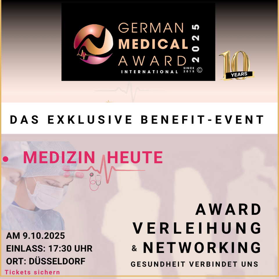 Am Donnerstag, dem 09. Oktober 2025, feiert der GERMAN MEDICAL AWARD© sein zehnjähriges Jubiläum im Haus der Ärzteschaft in Düsseldorf.
